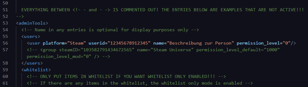 Anschließend kann hier in unserem Beispiel die SteamID den jeweiligen Spielers eingefügt werden. permission_level bedeutet hierbei Admin-Berechtigungen.