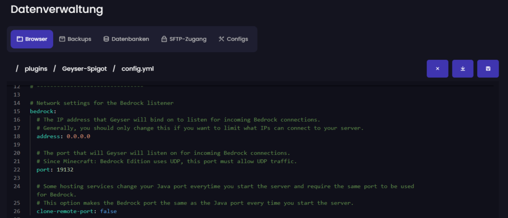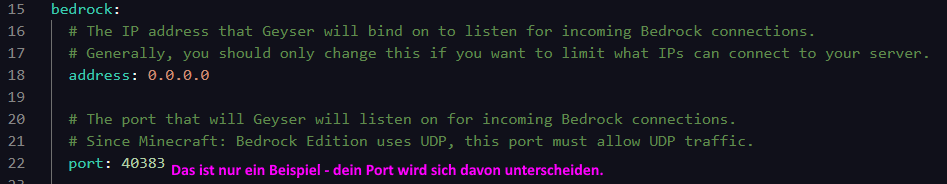 • bedrock > port: Unter dem Eintrag „bedrock“ findest du den Port-Wert. Setze hier einen deiner freien Ports, den du im vorherigen Schritt herausgesucht hast. Dieser Port wird dann für Bedrock-Spieler genutzt.