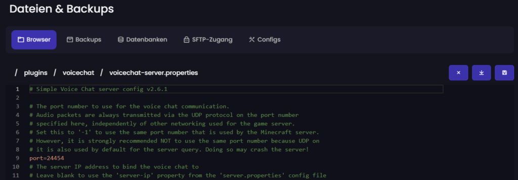 Öffne die Konfigurationsdatei für das Simple Voice Chat Plugin oder die Mod. Diese findest du unter dem Menüpunkt Dateien wie folgt: